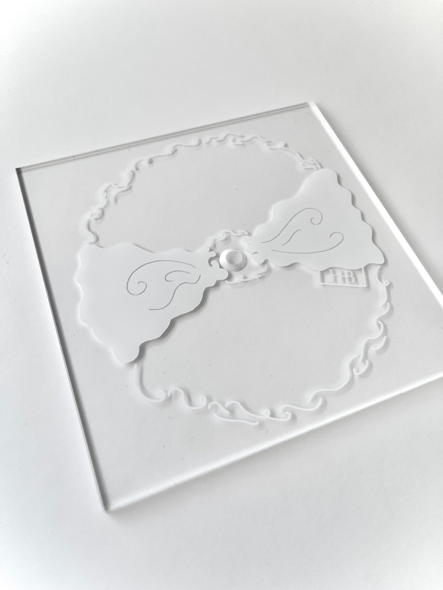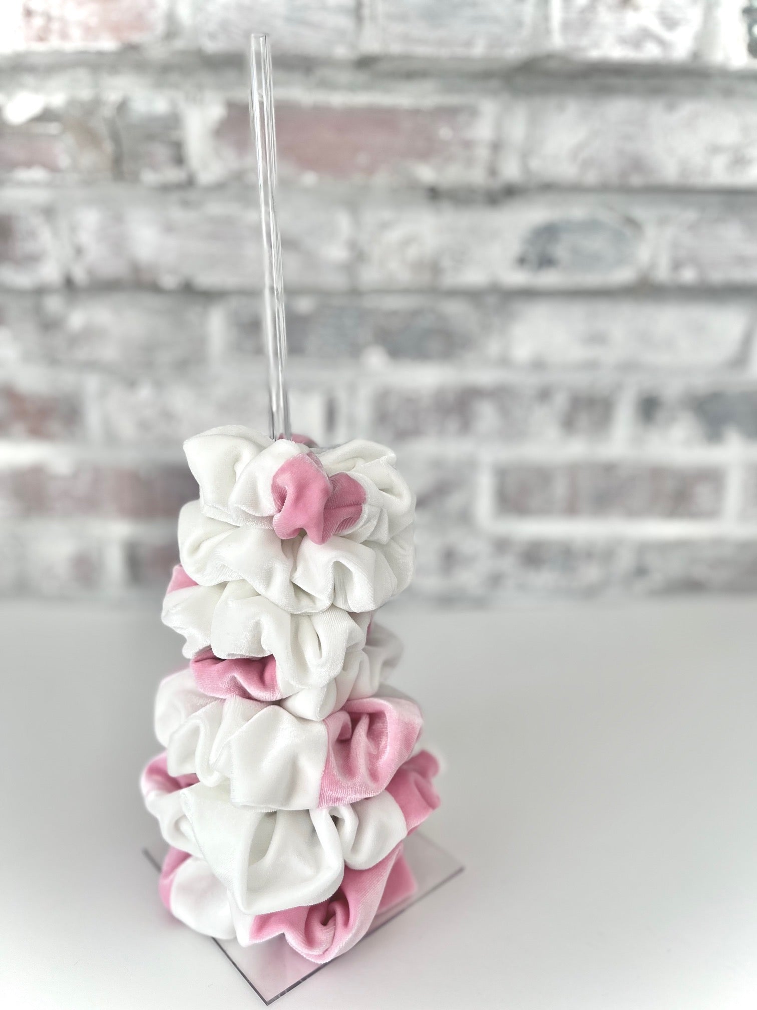 This acrylic scrunchie holder can showcase up to 12-15 of your favorite scrunchies. It features our original scrunchie bow artwork in soft white.